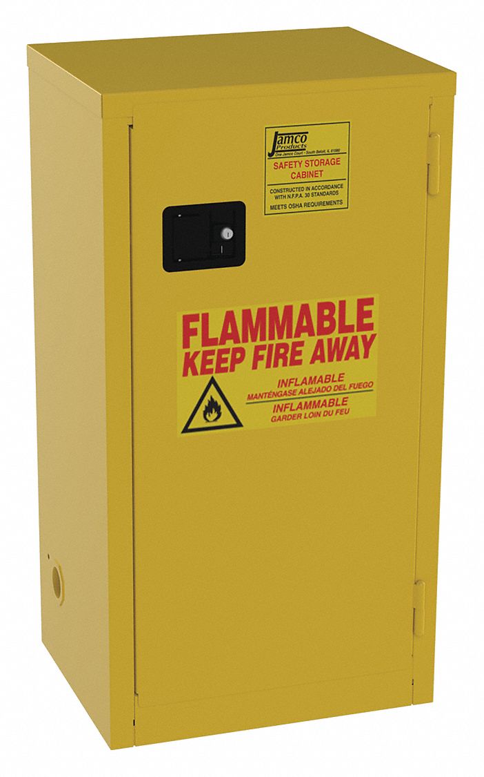 Nfpa flammable liquid storage cabinets. Its provisions are intended to reduce the hazard to a degree consistent with reasonable public safety without undue interference with public. Nfpa 30 paragraph 9 5 4 states that a storage cabinet is not required to be vented for fire protection. For example no safety cabinet is required to store less than 25 gallons of category 1 flammable liquids in approved containers. Models with powder coated yellow finishes and safety signage in large red letters are easily identified for storage of flammable liquids.